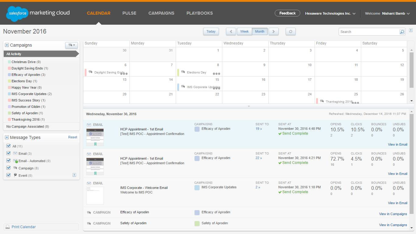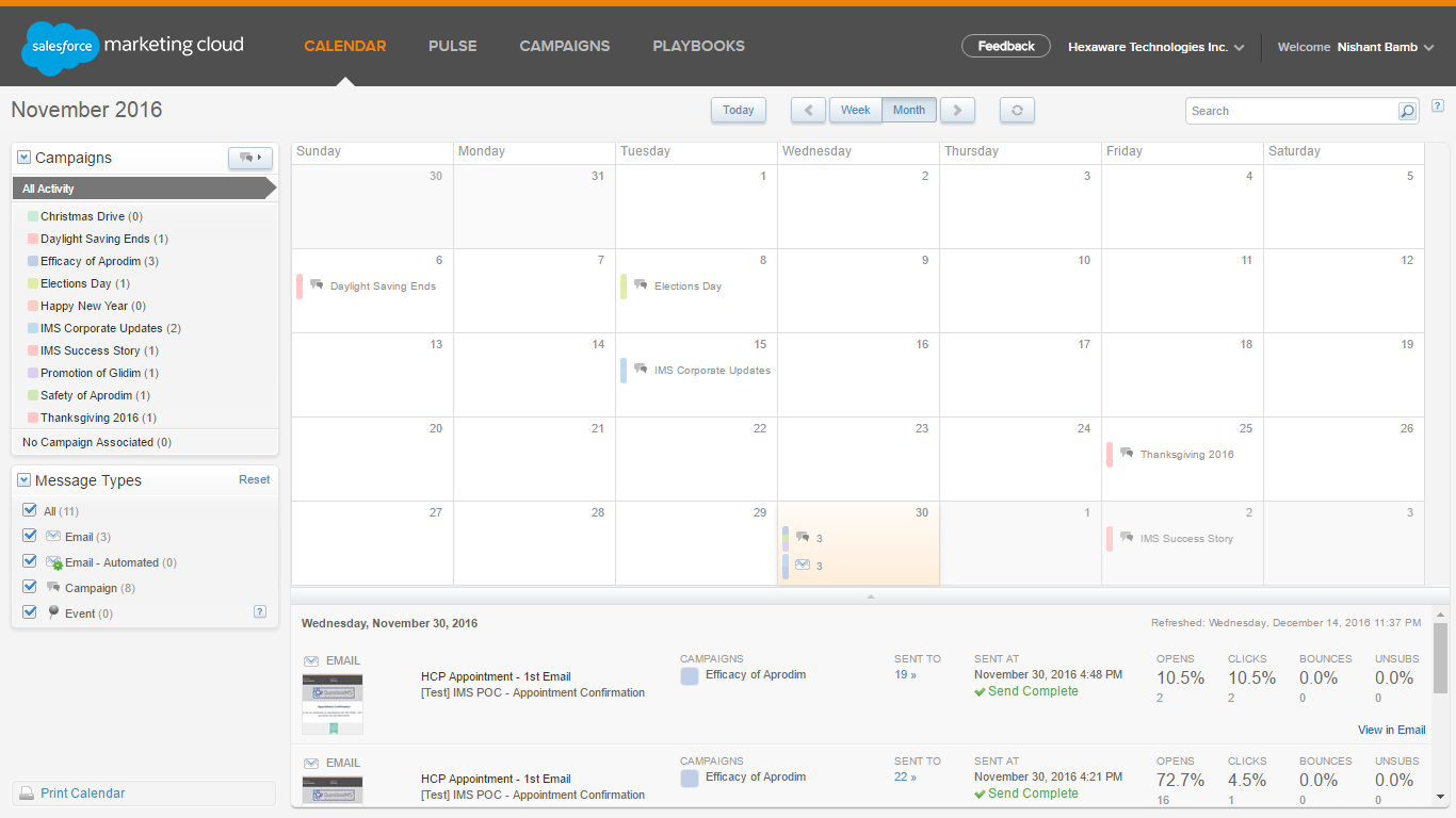 The Marketing Calendar shows scheduled and past emails, social posts, events and webinars. A slimmed down version of the calendar appears for Marketing and Administrator users on the dashboard, just below the graphs/charts.