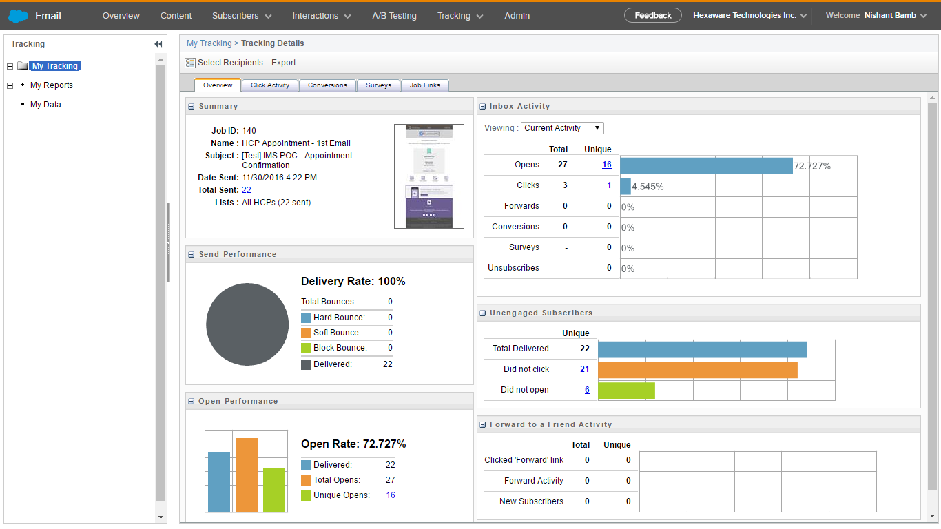 Analytics Builder enables you to gain deep insights into the behaviors and interests of your contacts across channels. Use these insights to set marketing goals and refine customer journeys. Analytics Builder can be used to measure engagement and performance of email campaigns, configure dashboard views to visualize data in flexible tables, charts, and graphs.