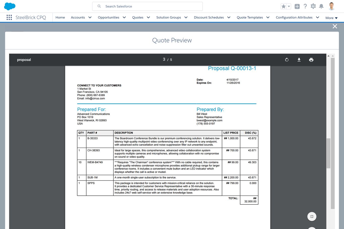With Salesforce CPQ, a sales rep quickly generates a quote, sends it via email, and can even include an e-signature to close the deal in just a few clicks. The software eliminates errors by automatically pulling in product data, calculating pricing, and accurately displaying product configurations. CPQ software can also generate a quote document that matches your company's branding guidelines, makes a polished and professional impression, and can help you seal the deal.